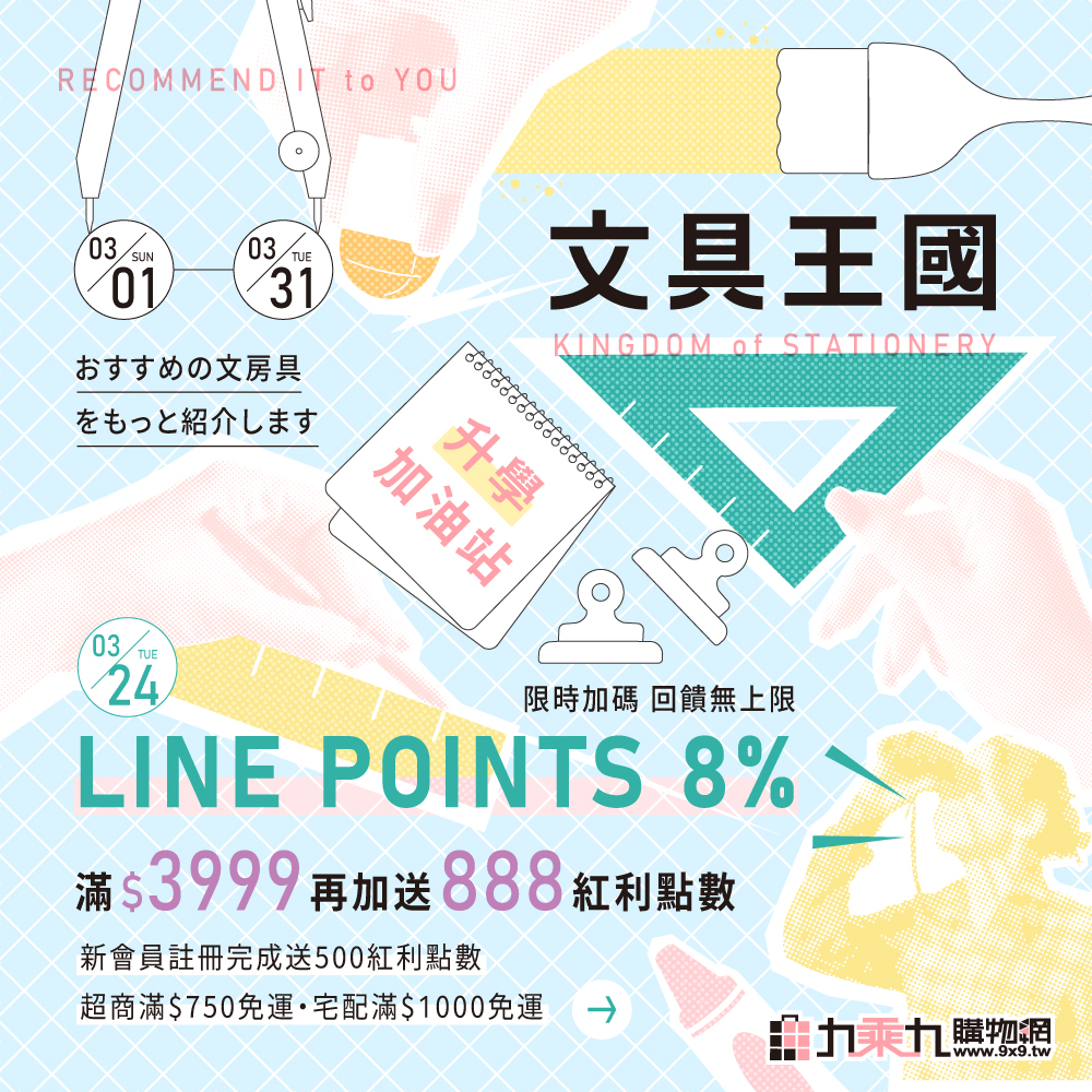 【3月文具王國】3/24 LINE購物限時加碼8%回饋