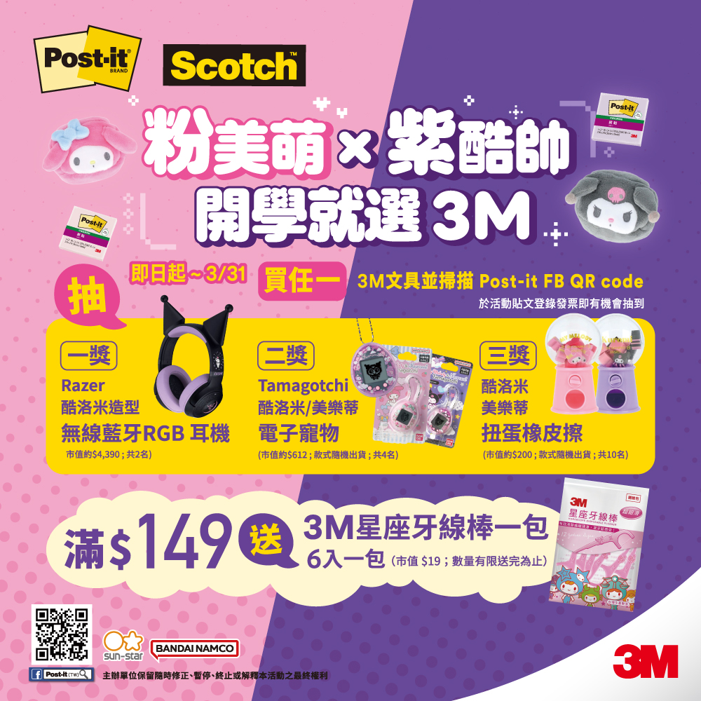 2.中獎名單將於2026/4/20起公告於3M Post-It Facebook粉絲專頁,並以電話通知。若主辦單位於7天內(2026/4/27)仍無法聯絡中獎者或無法確認中獎資訊, 則視為自動放棄中獎資格, 且不再遞補中獎者。