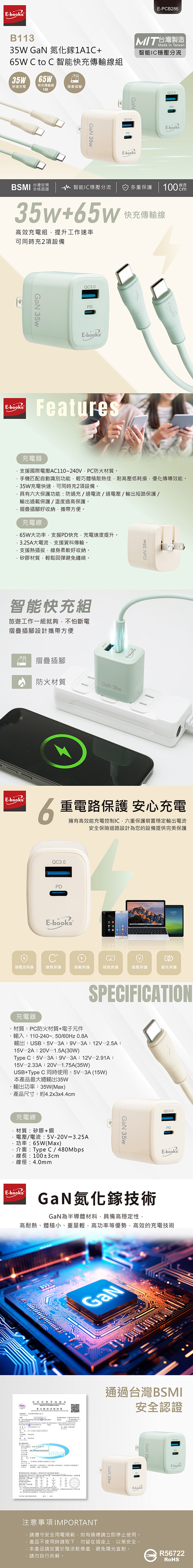 • 品名:E-books 35W 氮化鎵智能快充傳輸組