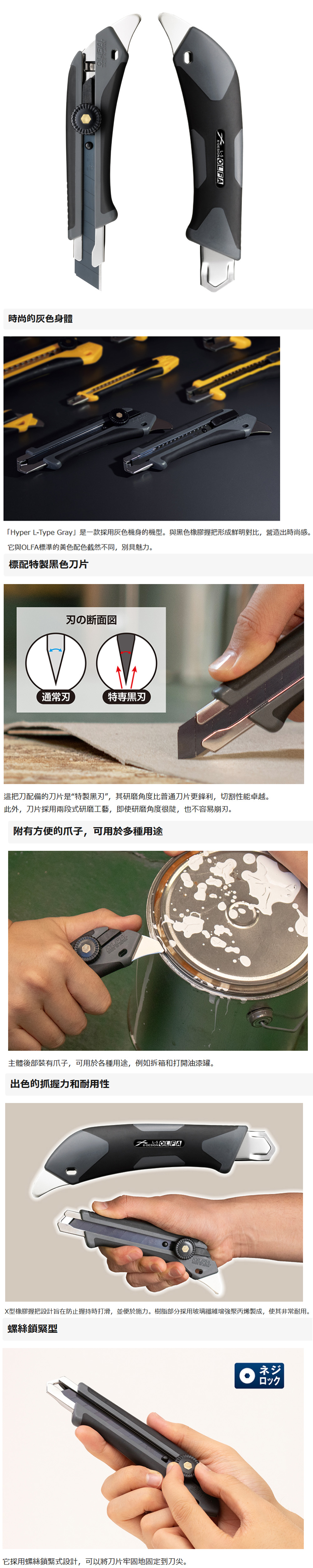• 「Hyper L-Type Gray」是一款採用灰色機身的機型。與黑色橡膠握把形成鮮明對比,營造出時尚感。它與OLFA標準的黃色配色截然不同,別具魅力。