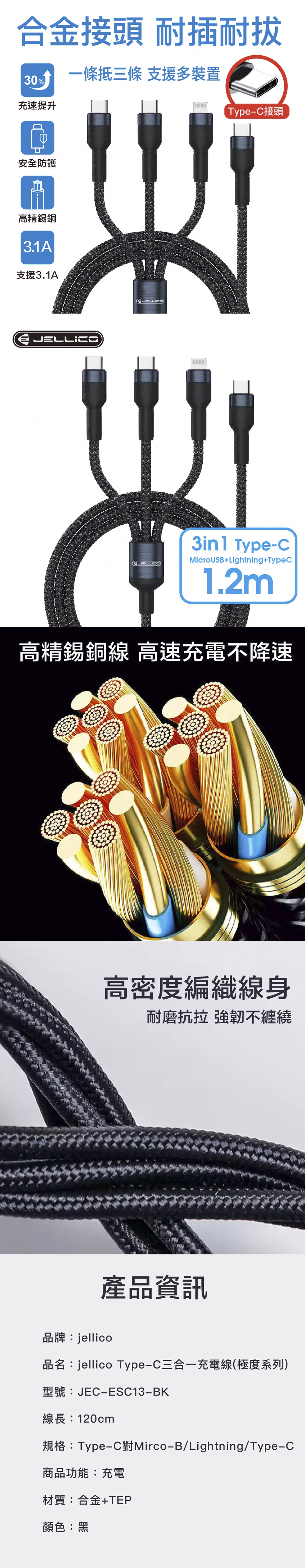 • 品名:JELLICO 極度系列Type-C版3合1快速充電線 1.2M