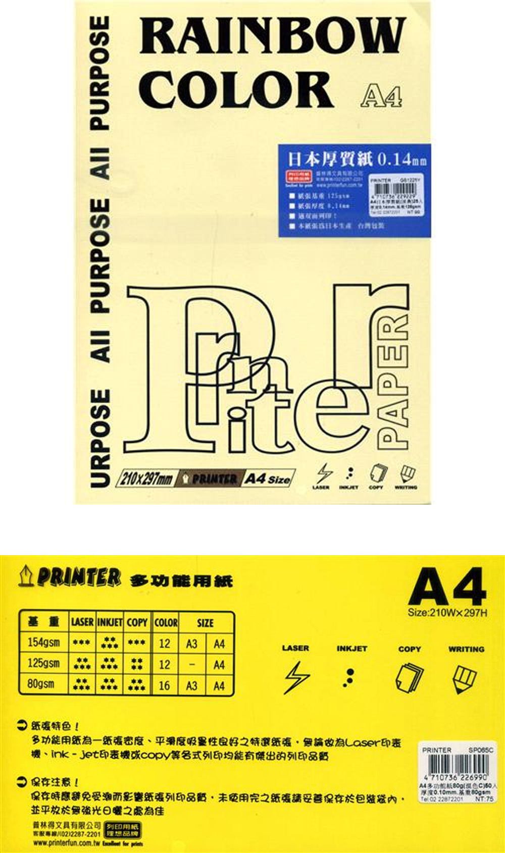 • 多功能用紙為一紙張密度、平滑度吸墨性良好之特選紙張,無論做為Laser印表機、ink-jet印表機或copy等各式列印均能有傑出的列印品質。