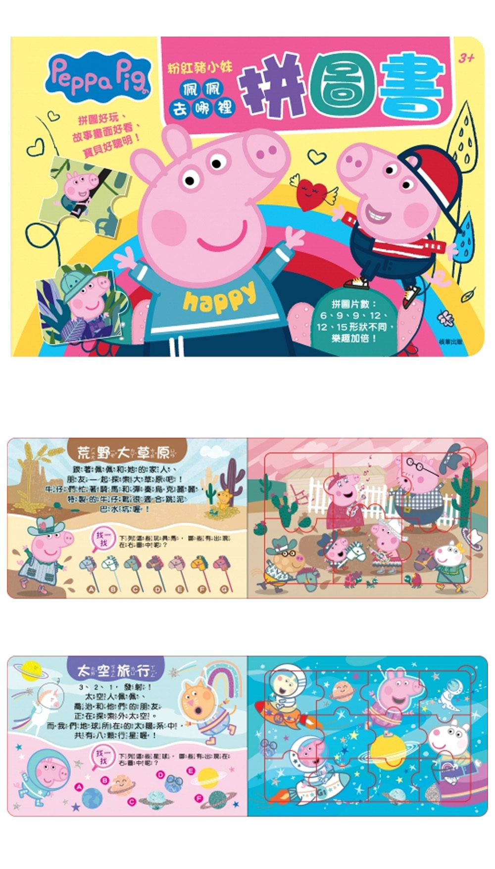 • 本書含6頁小拼圖,拼圖的片數為6、9、9、12、12、15片。快來邊拼拼圖邊認識佩佩和她的家人好友吧!
