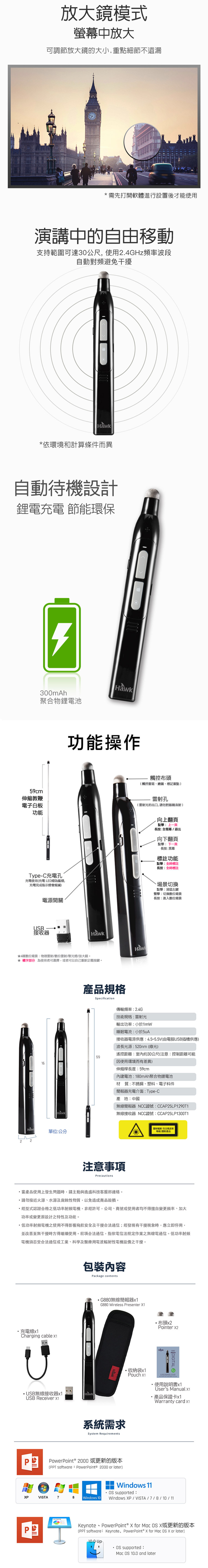 - 內容物:G880無線簡報器x1、USB無線接收器x1、充電線x1、布頭x2、使用說明書x1、產品保證卡x1、收納袋x1