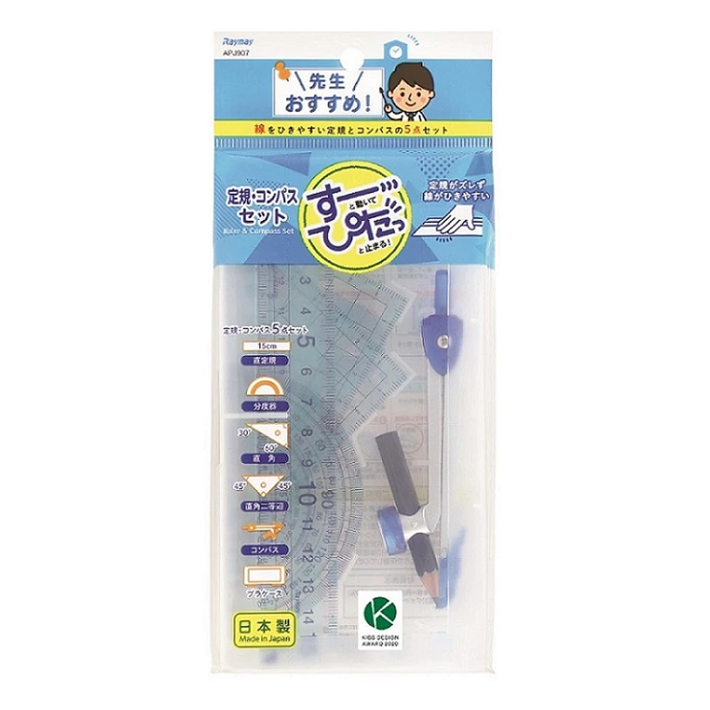 - 內容物:15cm直尺(APJ93)x1、三角板x2(APJ212)、量角器-小(APJ135)x1、圓規(鉛筆用)x1