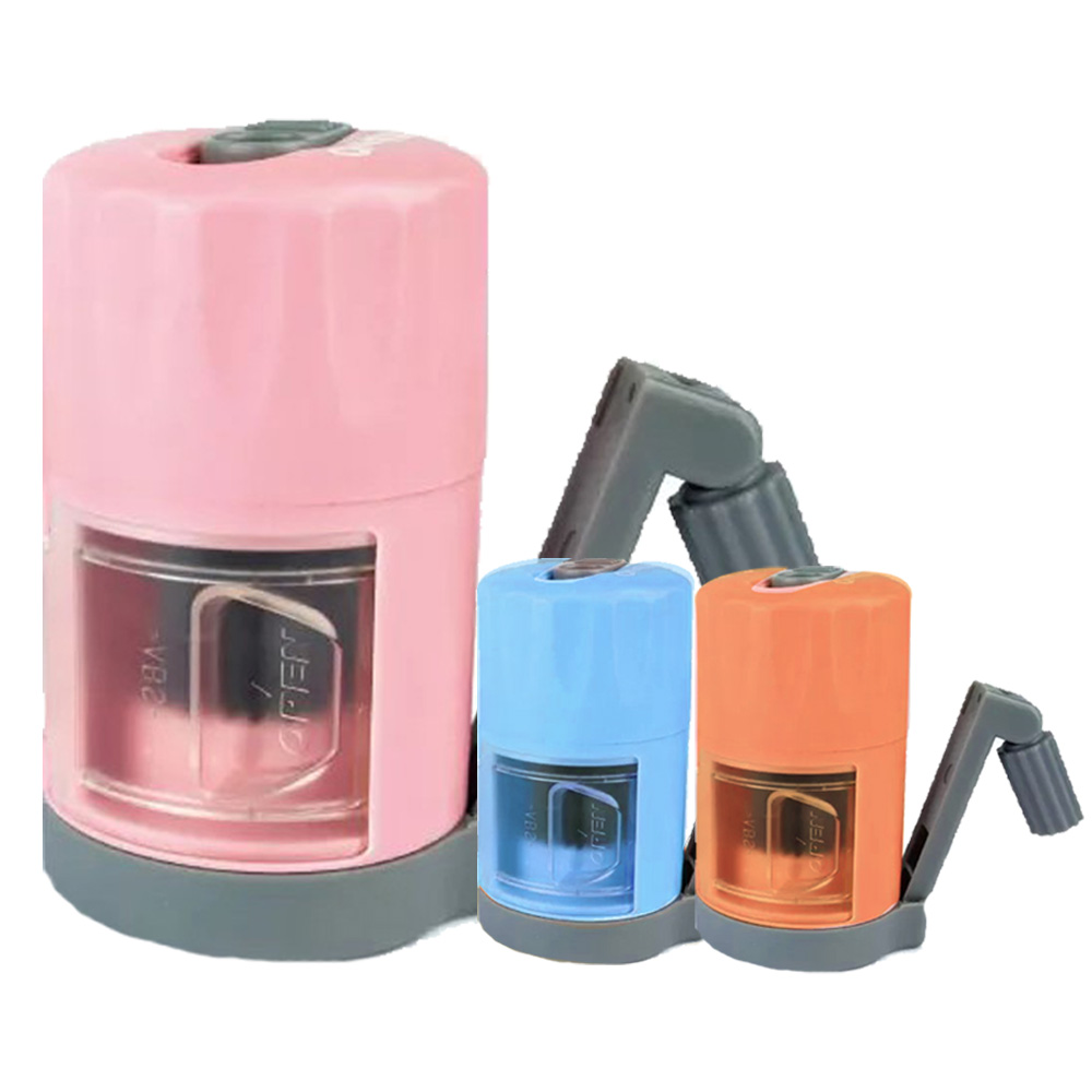 - 拉起搖柄後,將搖柄插入削鉛筆機內固定,再將簽筆放入削筆孔內,將搖柄順時鐘方向旋轉,由緊至鬆即可取出鉛筆