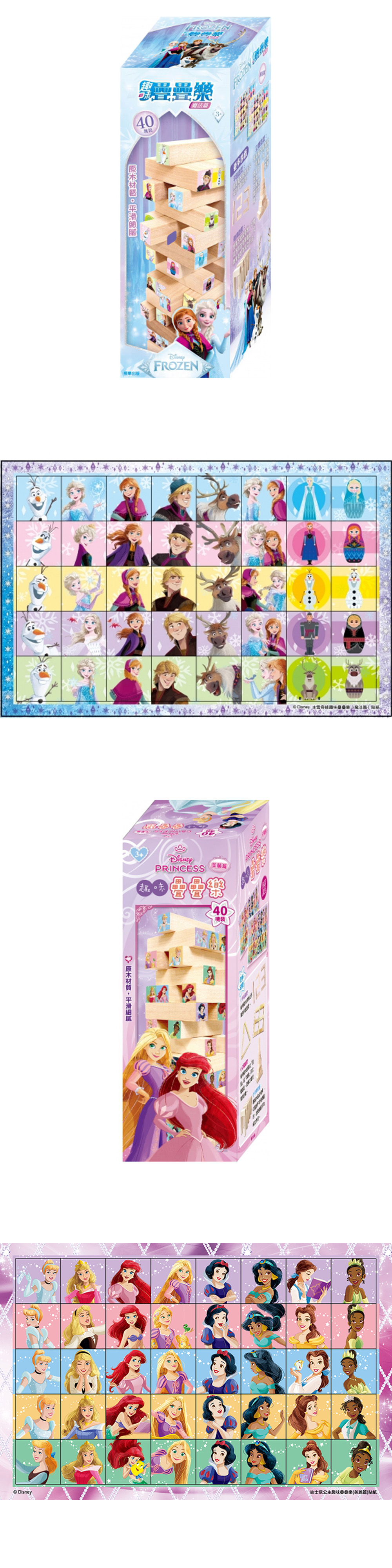 - 疊疊樂內容物:40塊木製積木與 冰雪奇緣/迪士尼公主角色積木貼紙兩張。