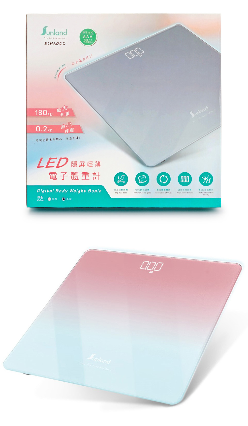 - 秤重範圍0.2-180kg,可測量體重或物品,用途更廣。