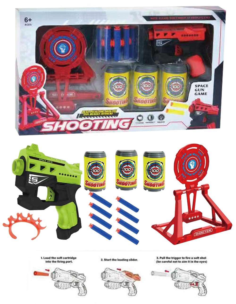 • 多功能射擊套裝:包含軟彈槍、多發軟彈、靶標及罐裝靶,玩法多樣