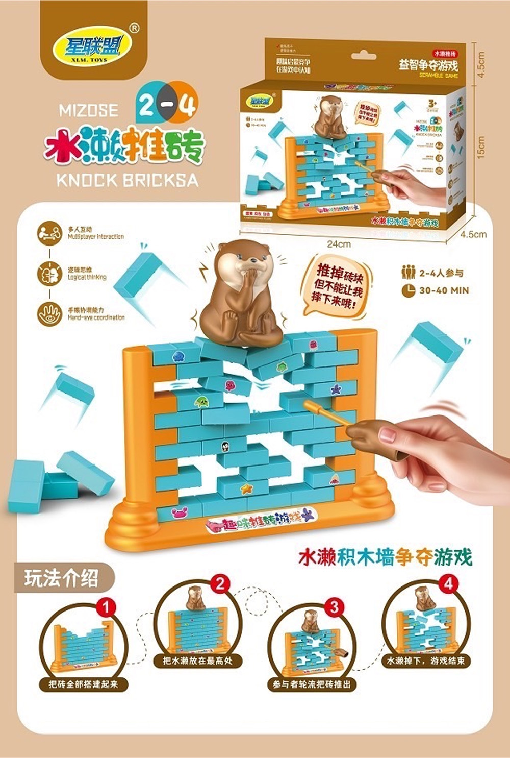 • 將磚塊搭建起來並將水獺放在頂部,玩家輪流推磚,讓水獺掉落者即為輸家