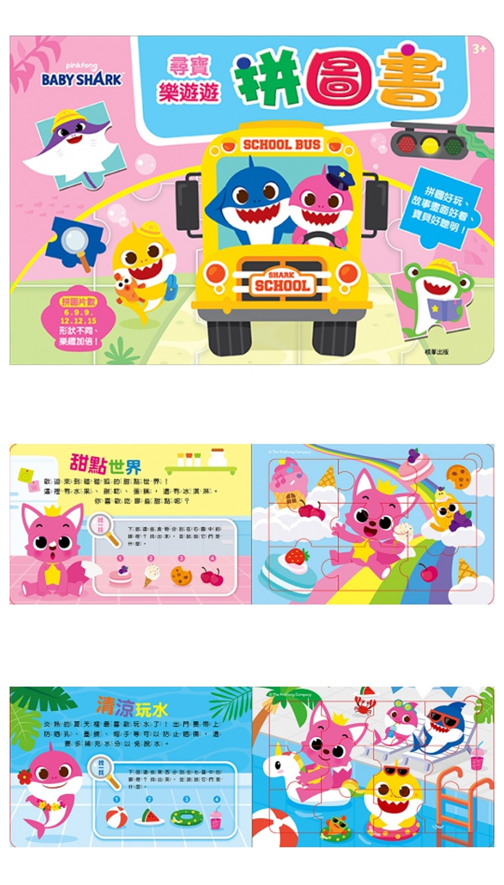 - 本書含6頁小拼圖,拼圖的片數為6、9、9、12、12、15片,和碰碰狐、鯊魚寶寶一起尋寶找一找!