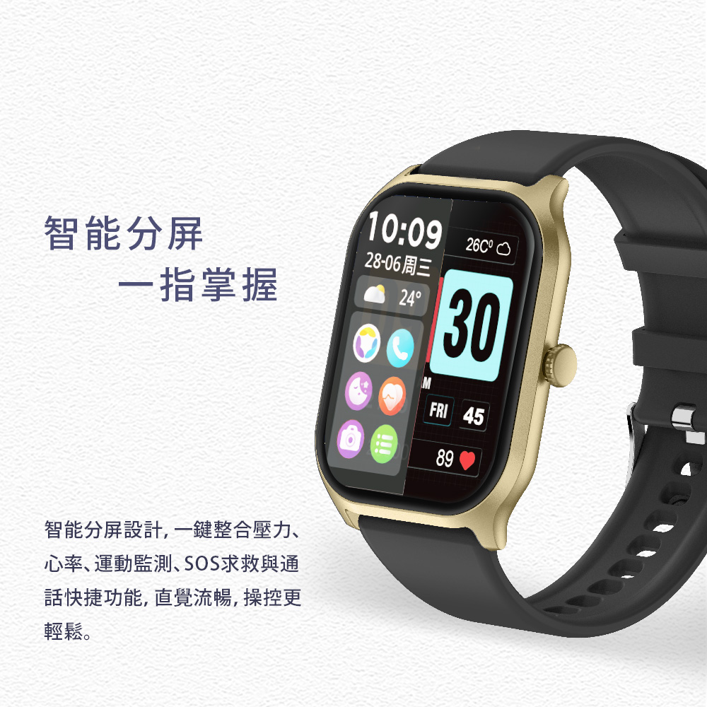 - 智能分屏|一指掌握:智能分屏設計,一鍵整合壓力、心率、運動監測、SOS求救與通話快捷功能,直覺流暢,操控更輕鬆。